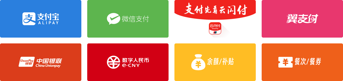 打通支付寶、微信支付、云閃付、翼支付、銀聯(lián)、數(shù)字人民幣、余額/補(bǔ)貼、餐次/餐券等主流支付渠道,實(shí)現(xiàn)多種支付工具統(tǒng)一聚合支付,提供統(tǒng)一智能對(duì)賬報(bào)表,支付便捷,對(duì)賬輕松