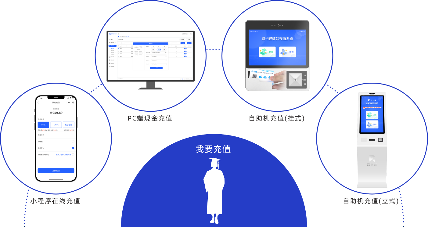 線上小程序充值+線下PC端充值+線下自助機(jī)充值方案,方便靈活,滿足不同行業(yè)、不同場景的充值需求