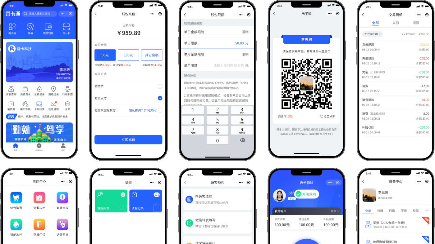 通過小程序可便捷地刷碼消費(fèi)、明細(xì)查詢、余額充值、限額設(shè)置(家長端)、掛失/換卡、訪客預(yù)約、請(qǐng)假、繳費(fèi)、掃碼用水、掃碼洗衣、電費(fèi)充值…,鏈接線上和線下應(yīng)用場景,智能便捷,且可不斷拓展