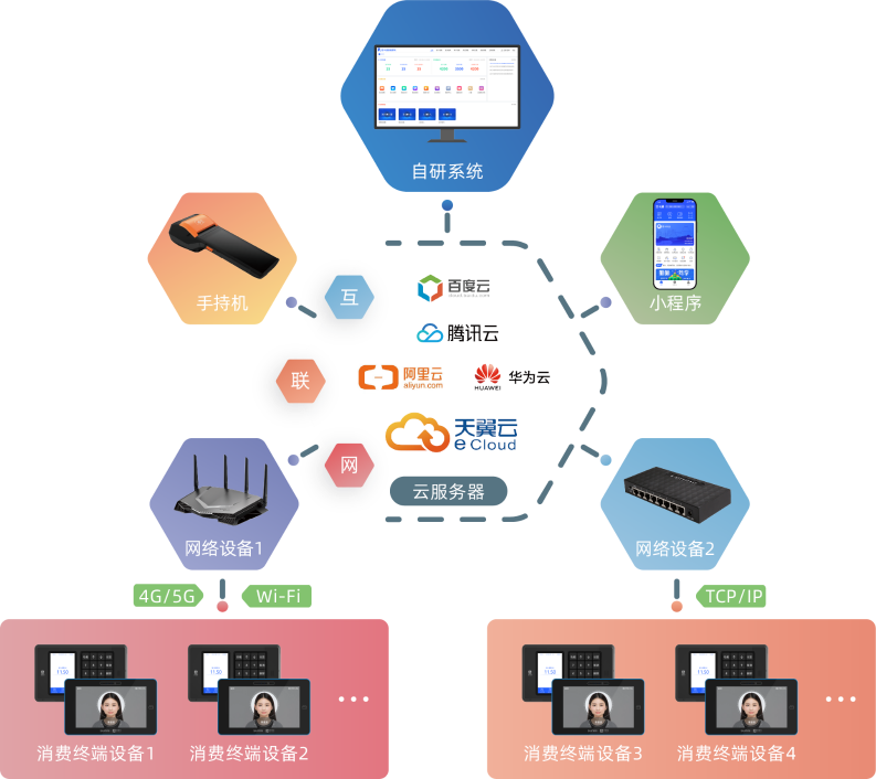 自研智能系統(tǒng)+云服務(wù)+智能設(shè)備+小程序,通過互聯(lián)網(wǎng)連接,軟硬件結(jié)合,組成一套全場景云端智能消費(fèi)系統(tǒng)。遠(yuǎn)程高效,實(shí)時(shí)智能,鏈接靈活,拓展性強(qiáng)。支付方式靈活豐富,刷臉+刷卡+二維碼+掌靜脈識(shí)別,豐富靈活,金融級(jí)生物識(shí)別安全可靠,可以按需求只有組合支付方式,輕松實(shí)現(xiàn)主流全行業(yè)覆蓋。同時(shí)提供本地組網(wǎng)方案