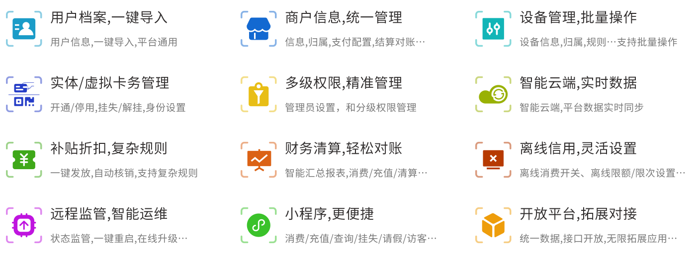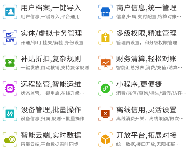 集用戶(hù)、商戶(hù)、設(shè)備、卡務(wù)、權(quán)限、規(guī)則、報(bào)表、運(yùn)維…等能力于一體的智能統(tǒng)一管理平臺(tái)