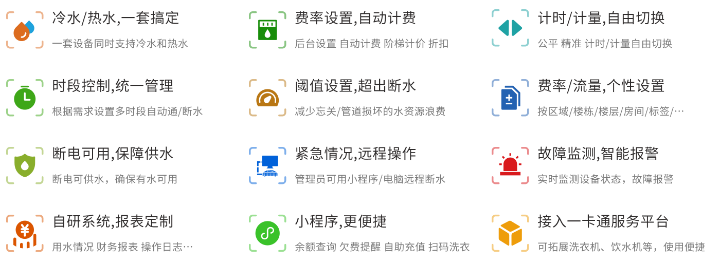 除了最基礎的生活、洗浴和開水,現有更多拓展,一卡/一碼/一臉/一掌通用,更智能,更便捷